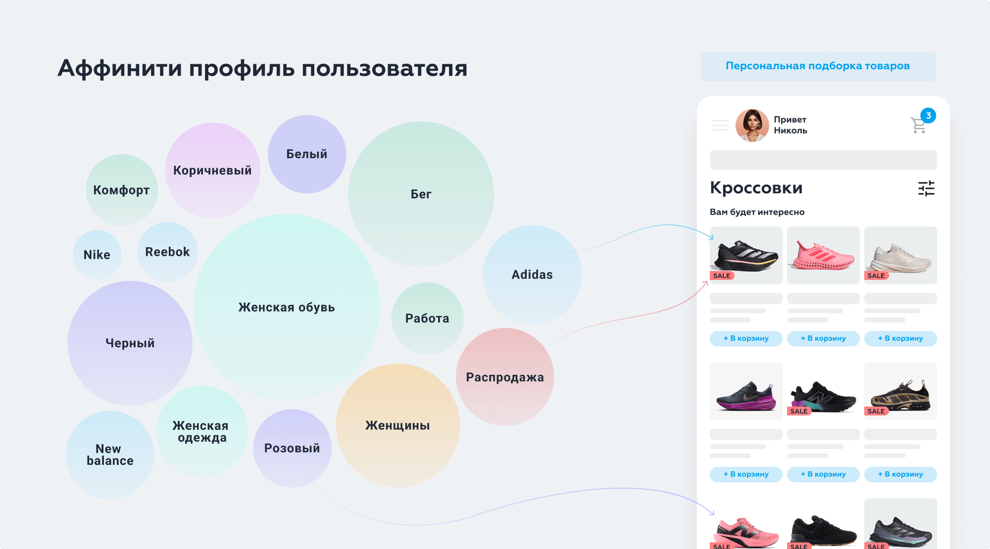 Можно учитывать приоритеты в выдаче, правила показа, сегменты пользователей и товарные рекомендации.
