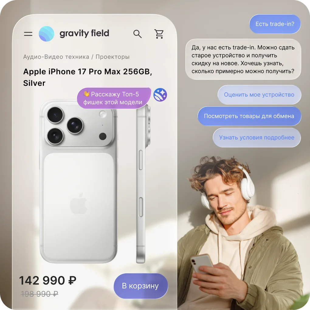 Gravity AI построен на возможностях Gravity Field. Поэтому консультант не приходится собирать с нуля: он уже умеет работать с каталогом, учитывать правила показа товаров, использовать персонализацию и показывать результат в бизнес-метриках.